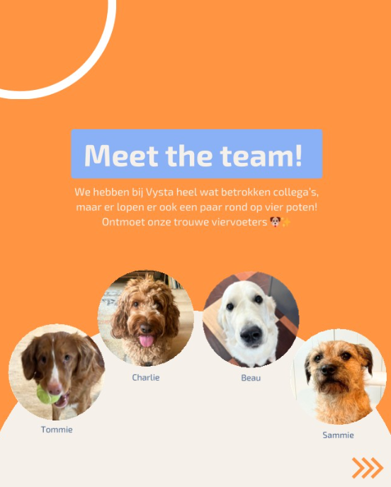 - Een gezellig en hecht team + onze kantoorhonden Beau, Tommie, Sammie en Charlie die soms op kantoor te vinden zijn!